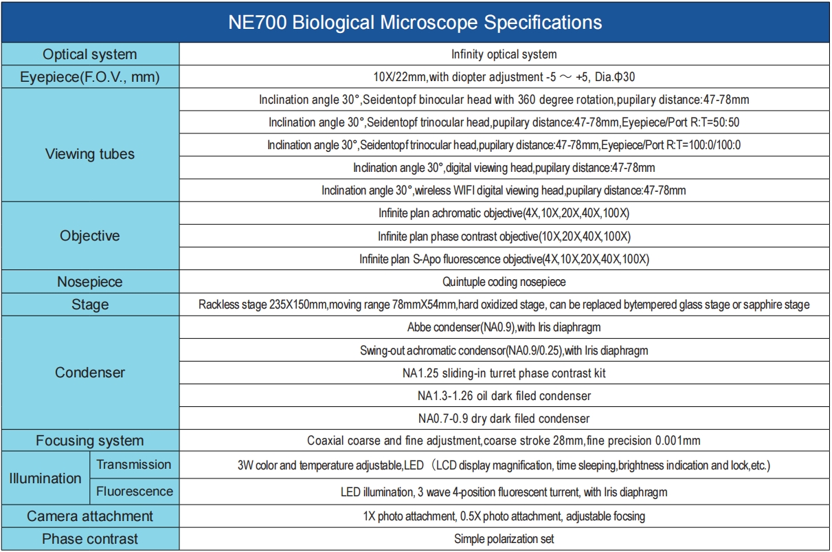 NE700 employs NIS series plan archromatic objectives,which feature flat,sharp images up to the periphery of the field of view. High numerical aperture(NA) and long working distances,with high resolution, and a wide variety of usage are available.Restore the real colors and realize accurate observation of samples.